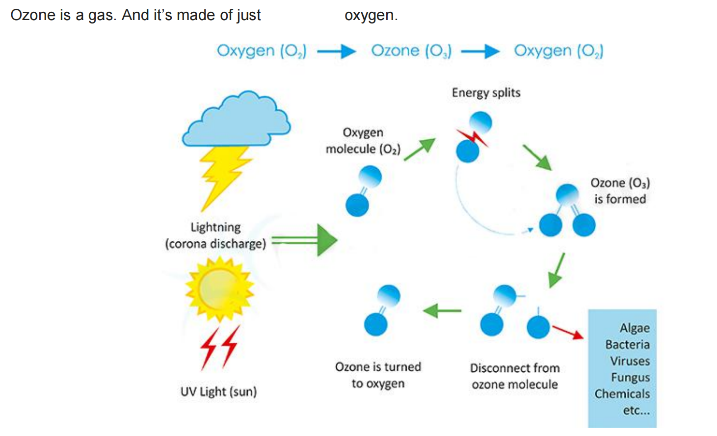 Ozone is a gas. And it's made of just one thing-oxygen. Ozone is a very strong disinfectant and oxidizer. Any pathogen or contaminant that can be disinfected, altered or removed via an oxidation process will be affected by ozone. It is the strongest of all molecules available for disinfection in water treatment, and is second only to elemental fluorine in oxidizing power. Compared to chlorine, the most common water disinfection chemical, ozone is a more than 50% stronger oxidizer and acts over 3,000 times faster. Both chlorine and fluorine are highly toxic chemicals.